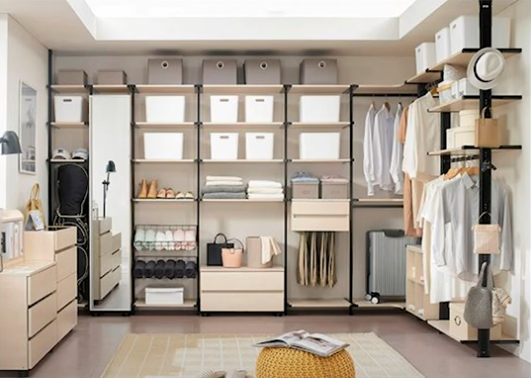 프리메이드 제품은 이름 그대로 넓고 와이드한 수납 공간이 강점입니다. 바닥에는 신발이나 상자류를 둘 수 있고, 상단에는 계절용 이불이나 덮개류를 수납할 수 있어, 천장까지의 공간을 빈틈없이 활용할 수 있어요.