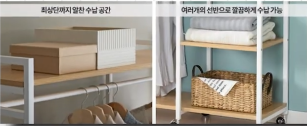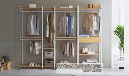 강화 알루미늄 옷걸이 봉은 무거운 겨울 코트를 걸어도 휘어지지 않고 튼튼한 지지력을 보여줍니다. 선반은 고정식이 아니기 때문에, 계절에 따라 높이를 조절하면서 효율적인 공간 배치를 할 수 있다는 점도 매력적이에요. 붙박이장을 들이기 부담스러운 신혼부부나 자취생에게 적극 추천하는 제품입니다.