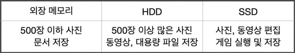 - HDD (하드디스크) : 대용량 파일 저장용 / 가성비 좋음