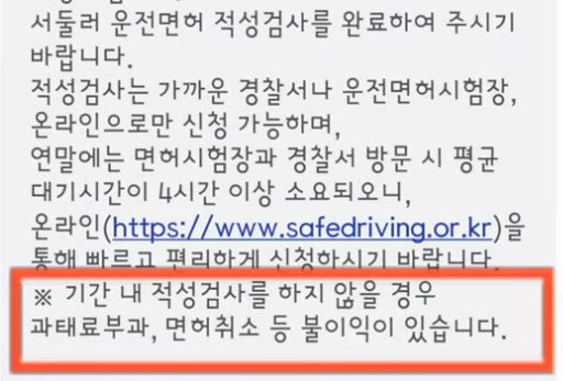 기간 내 검사를 하지 않으면 과태료 부과, 면허 취소 등의 불이익이 생기니 반드시 기한을 확인하세요.
