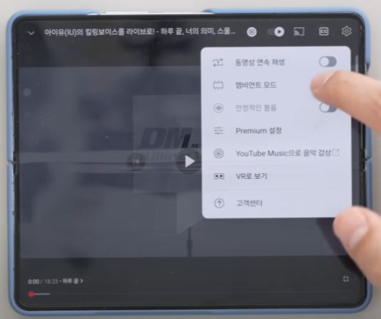 특히 갤럭시 폴드처럼 큰 화면에서 영상 상하에 생기는 검은 여백, 거슬리셨죠? 이럴 땐 오른쪽 위 설정 > 추가 설정 > 엠비언트 모드를 켜보세요. 영상 분위기에 맞는 색으로 여백을 채워줘서 훨씬 보기 좋습니다.