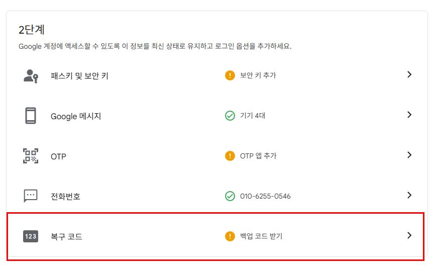5. 안전하게 보관 - 백업 코드는 1회만 사용 가능하며, 새로운 코드가 필요할 경우 다시 생성해야 합니다.