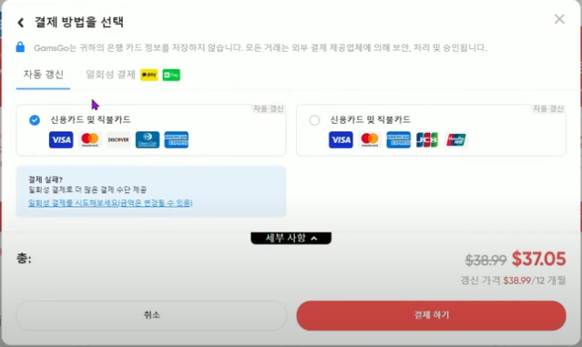 1. 자동 갱신 신용 카드 결제나 일회성 결제 중 선택하여 주시면 됩니다.