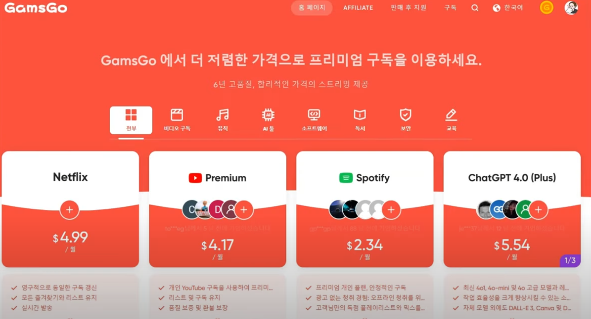 겜스고는 해외 구독 공유 플랫폼으로, 유튜브 외에도 넷플릭스, 디즈니+, ChatGPT 등 다양한 서비스를 더 저렴하게 이용할 수 있는 곳이에요.