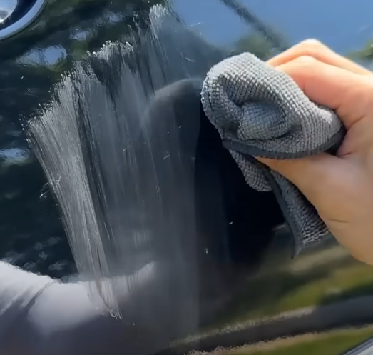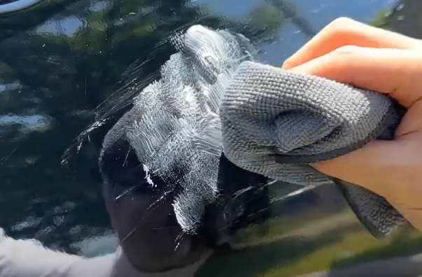흠집 부위를 중심으로 역방향으로 살살살 문질러 주세요. 너무 힘을 주면 주변까지 깎이기 때문에 꼭 부드럽게! 중간중간 마른 수건으로 닦아가며 상태를 체크하면서 작업해 주세요. 광이 날아가고 흠집이 사라졌다면, 이제 컴파운드로 마무리할 차례입니다.