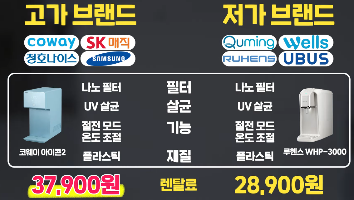 정수기는 코웨이, LG와 같은 고가 브랜드와 현대큐밍, SK매직 같은 가성비 브랜드로 나뉩니다. 같은 필터, 같은 살균 기능을 갖추고 있어도 유명 브랜드는 평균 30% 더 비싸죠. 브랜드 네임 밸류를 제외하면 실질적인 차이는 ‘케어 서비스’입니다.