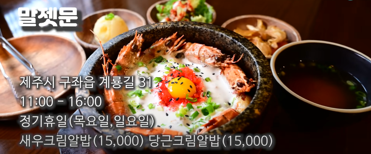 구좌에 위치한 작은 감성 맛집 말젯문. 따뜻한 돌솥밥 위에 새우와 날치알이 듬뿍 올라간 새우 알밥이 인기 메뉴예요. 고소한 생크림과 함께 비벼 먹으면 입안 가득 퍼지는 풍미가 남다릅니다. 긴 웨이팅과 재료 소진이 잦으니 방문 전 확인 필수!