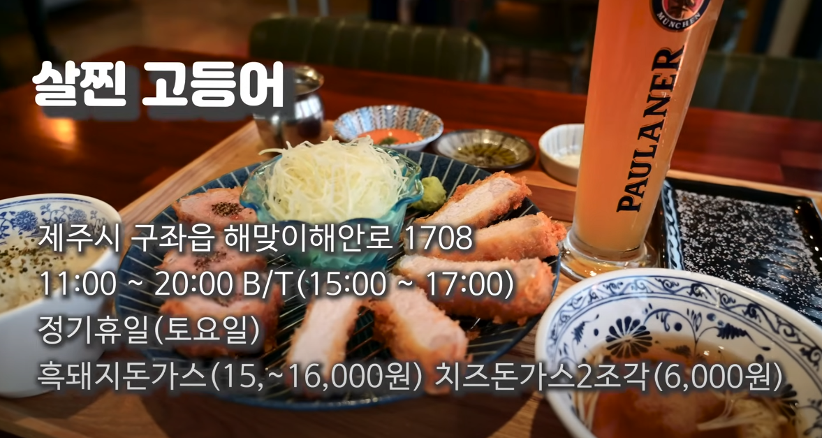 하도리 해변 근처에 위치한 살찐고등어에서는 제주산 흑돼지를 240시간 숙성한 돈가스를 맛볼 수 있어요. 바삭한 수제 빵가루와 촉촉한 돼지고기의 조화가 일품! 여기에 감칠맛 나는 독일식 수제 맥주까지 곁들이면 완벽한 한 끼가 됩니다. 성수기에는 재료 소진 마감이 빠르니 서두르는 게 좋아요.