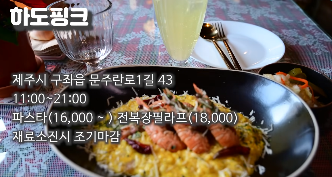 하도리의 숨은 보석 같은 곳, 하도핑크. 작지만 분위기와 음식 퀄리티가 뛰어나요. 파스타와 리조또가 대표 메뉴인데, 정성이 가득 들어간 요리와 감성적인 공간이 어우러져 한 끼를 더욱 특별하게 만들어줍니다. 재료 소진이 빠르니 일찍 가는 걸 추천해요.