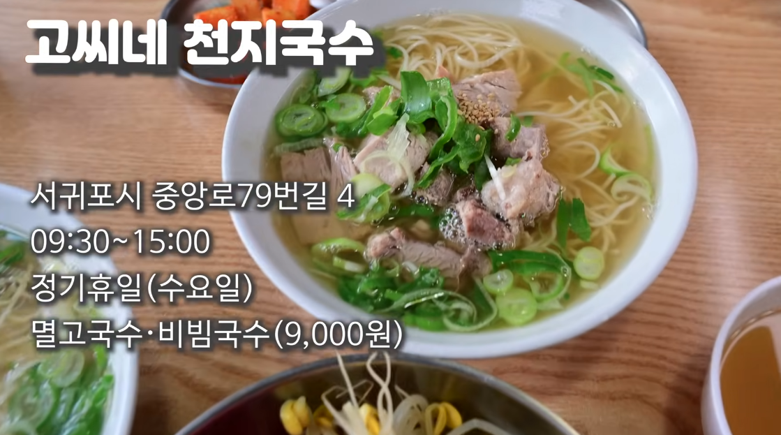 서귀포에서 꼭 가봐야 할 고기국수 맛집, 고씨네 천지국수! 이곳은 멸치 국물을 베이스로 한 고기국수가 유명한데요. 국물이 맑고 깔끔해서 국수 본연의 맛을 그대로 즐길 수 있어요. 돼지고기 고명이 듬뿍 올라가는데, 고기는 부드럽고 담백해서 국물과 함께 먹으면 정말 맛있어요. 비빔국수도 별미라서 함께 시켜보세요! 🍽️