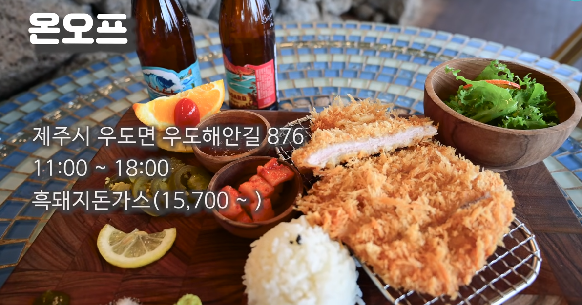 카고수동 해변을 바라보며 식사를 즐길 수 있는 온오프는 감성적인 분위기와 함께 맛까지 보장되는 곳이에요. 흑돼지 돈가스가 대표 메뉴인데, 바삭한 튀김옷과 촉촉한 고기의 조합이 정말 끝내줍니다.