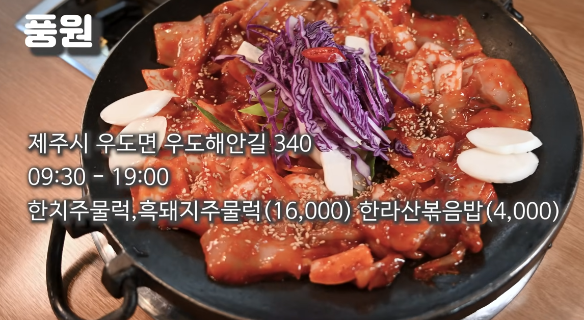하우목동 포구 근처에 위치한 풍원은 제주산 한치와 흑돼지를 활용한 한치 주물럭과 흑돼지 주물럭이 유명한 곳이에요. 철판 위에서 채소와 함께 볶아 먹으면 쫄깃한 한치의 식감과 특제 양념의 조화가 끝내줍니다.
