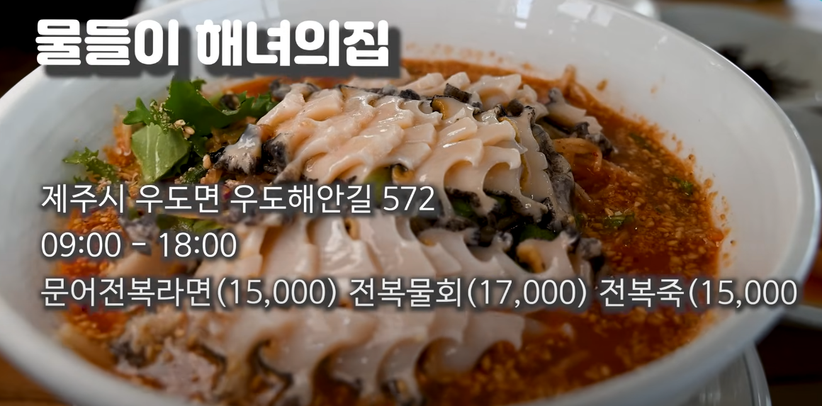 신선한 해산물을 한가득 즐기고 싶다면? 해녀 사장님이 운영하는 물들이 해녀의집을 추천해요! 이곳에서는 전복물회와 해물라면이 인기 메뉴인데요.