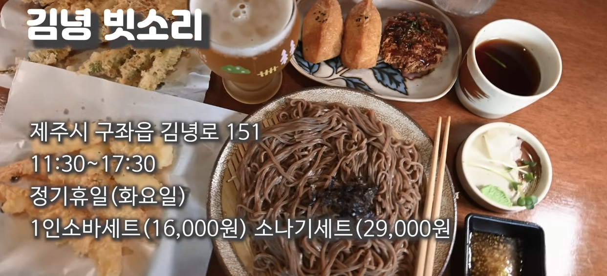 김녕 해수욕장 근처에 위치한 이곳은 소바와 튀김이 일품인 곳이에요. 바삭한 튀김을 한입 베어 물고, 시원한 모밀국수에 푹 담갔다가 먹으면 그 조합이 환상적이랍니다. 특히 1인 소바 세트는 가성비 최고라 혼밥러들에게도 강추!