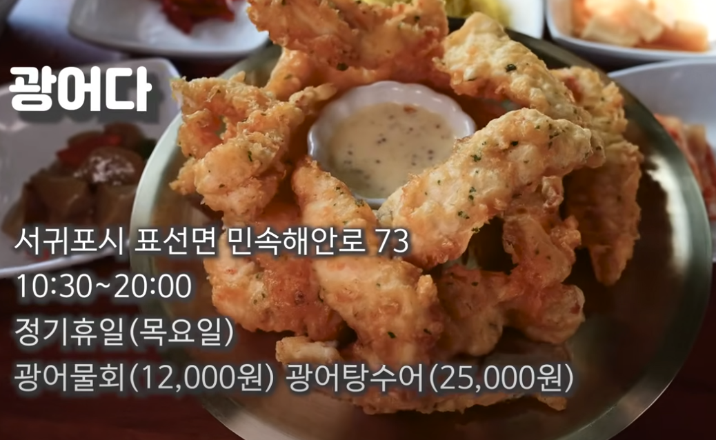 표선 해안이 한눈에 내려다보이는 '광어다'는 직접 양식한 광어를 사용해 믿고 먹을 수 있는 곳이에요. 이곳의 시그니처 메뉴는 바로 '광어탕수어'! 과일 향 나는 특제 소스에 찍어 먹는 생선가스 스타일인데, 처음 먹어보면 깜짝 놀랄 만큼 맛있어요. 회국수, 광어물회, 광어 미역국까지 메뉴가 다양해서 회 좋아하시는 분들에겐 천국이죠. 2층에서는 바다뷰도 감상할 수 있어요. 다만 성수기에는 재료가 빨리 소진되니 일찍 방문하는 게 좋아요. ⏰