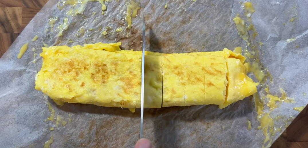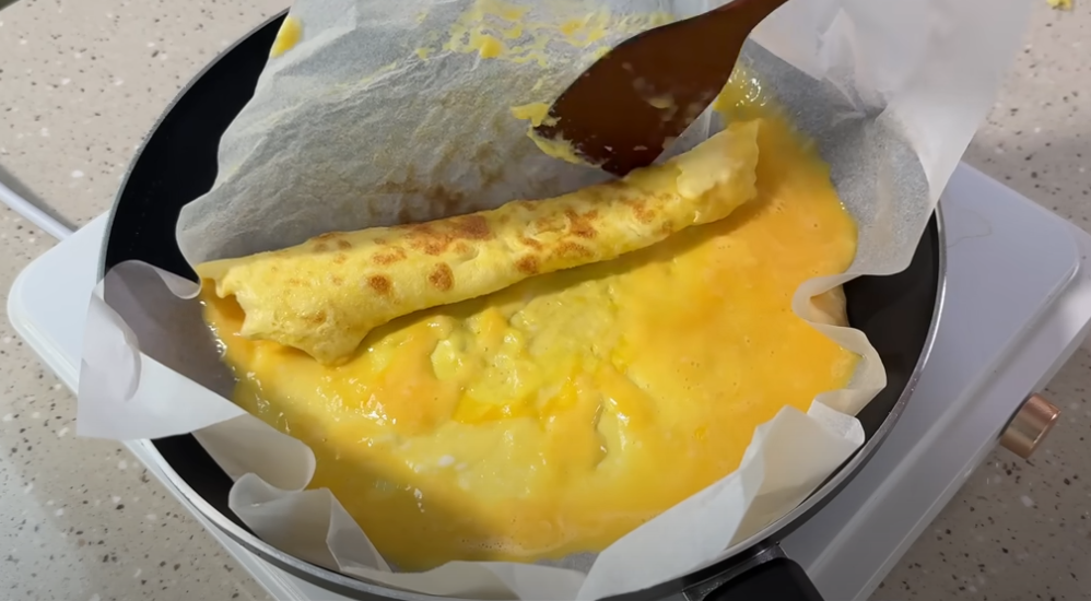 프라이팬에 종이호일을 깔고 계란을 부으면 달라붙지 않고 모양이 예쁘게 나와요. 호일을 살짝 잡아 뒤집으면 손쉽게 말 수 있어서 요리 초보에게도 강추!