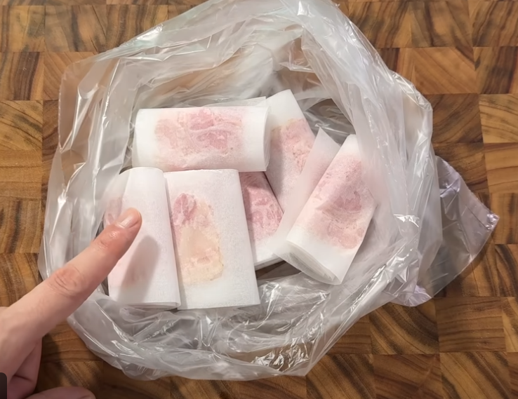 베이컨을 종이호일에 하나씩 올려 말아 보세요. 돌돌 감은 후 가위로 한 줄씩 잘라 지퍼백에 보관하면 필요할 때마다 꺼내 쓰기 간편합니다. 기름기도 덜 묻고 깔끔하게 정리돼요.