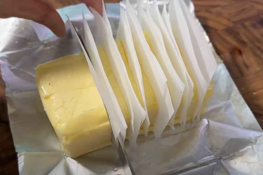 차가운 버터 썰다 보면 칼에 달라붙어 난감할 때 많죠. 이때 종이호일로 칼을 감싼 뒤 자르면 버터가 깔끔하게 잘리고, 손에 묻지도 않아 편리합니다.