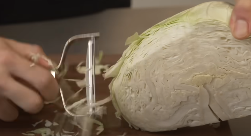 양배추를 얇게 채 썰 수 있는 필러입니다. 톱니 모양의 날 덕분에 울퉁불퉁한 양배추도 쉽게 썰 수 있어요. 다만, 먹지 않는 부분에도 톱 모양의 홈이 생기기 때문에 자른 단면이 금방 검게 변할 수 있고, 채를 썰 때 살짝 걸리는 느낌도 있을 수 있어요.