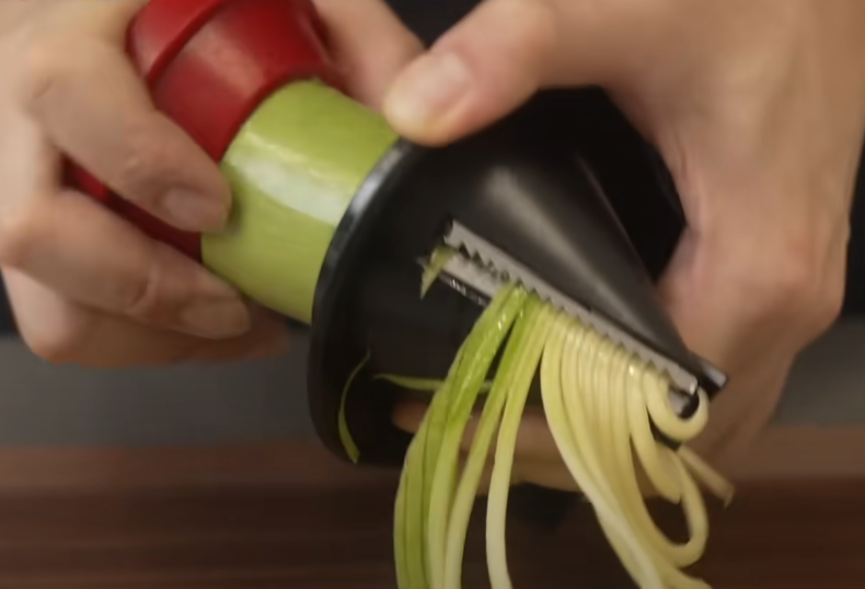 야채를 길게 면처럼 채 썰 수 있는 제품입니다. 일반 채칼보다 훨씬 길고 일정한 채를 뽑을 수 있어요. 밀가루 대신 채소면을 만들 때 아주 유용합니다.
