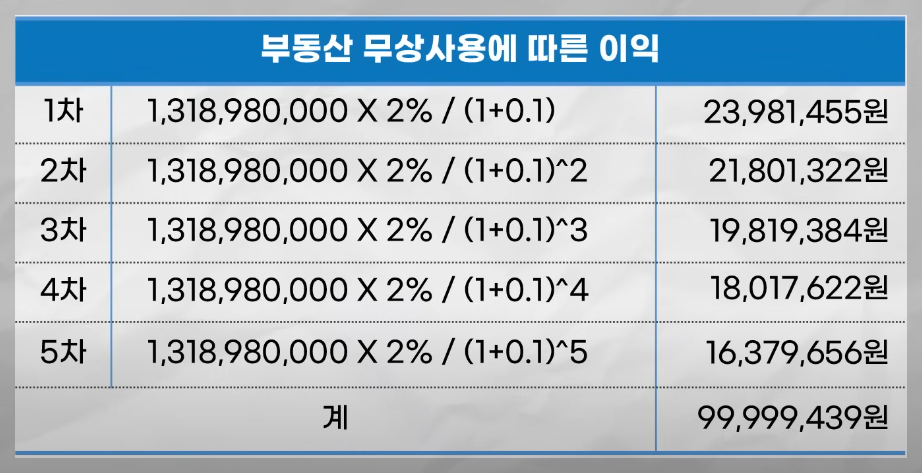 부동산 무상 사용의 경우엔 5년간 1억 원의 사용가치를 넘지 않으면 증여세 과세가 어렵습니다. 이를 기준으로 보면 13억 1,800만 원 이하의 부동산에서 5년간 무상 거주하면 괜찮다는 해석이 가능하죠.