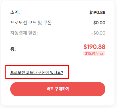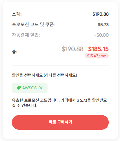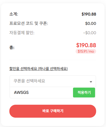 4. 쿠폰을 적용하거나 할인 코드 AWSGS 입력하시면 추가 할인을 또 받으실 수 있으니 꼭 잊지말고 적용해 주세요.