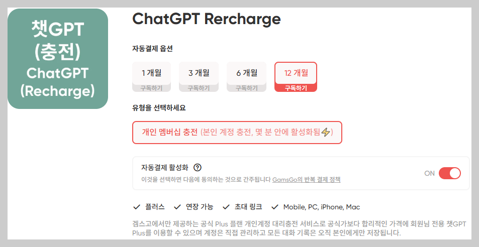 1) ChatGPT Recharge 자동결재 옵션에서 원하는 충전 기간을 선택합니다. (1개월, 3개월, 6개월, 12개월)