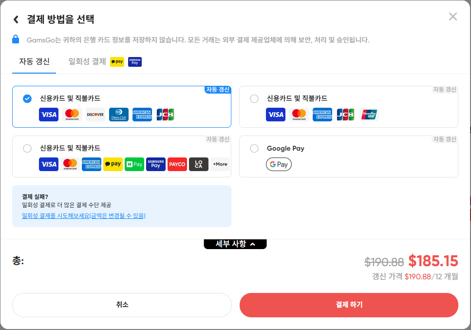 - 네, 안전합니다. 겜스고는 결제 대행 과정에서만 1회성으로 Access Key를 사용하며, 대화 내용이나 기타 데이터에는 접근할 수 없습니다.