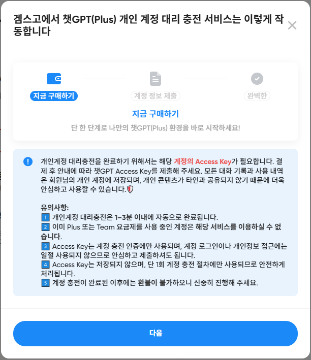 5. 결제 전 개인 계정 대리 충전 서비스 작동 방식에 대한 설명문이에요. 유의 사항을 읽어 보신 후 다음을 클릭해 주세요.