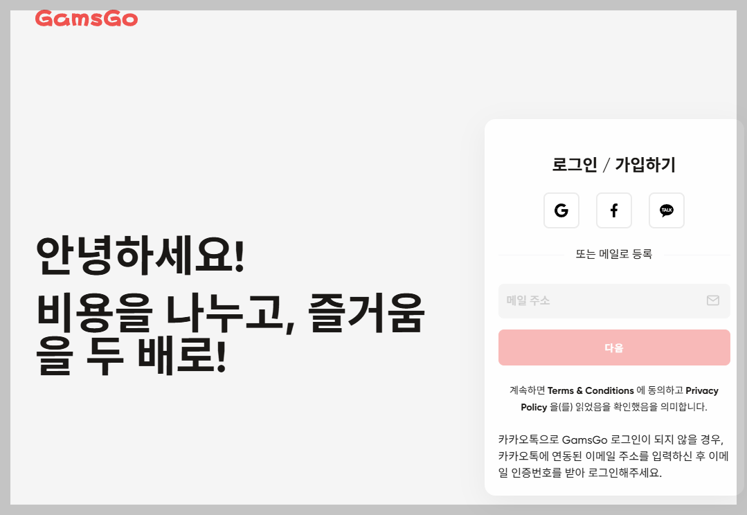 아래 링크는 공식 파트너에서 제공하는 추가 할인이 가능한 겜스고 공식 홈페이지 링크예요. 구글이나 카톡 등으로 간편하게 가입이 가능해요.