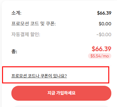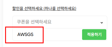 '프로모션 코드나 쿠폰이 있나요?' 버튼을 클릭해요. 할인 쿠폰을 선택하거나 프로모션 코드 AWSGS를 입력하시면 추가 할인을 또 받으실 수 있어요. 놓치지 말고 꼭 입력하세요. 입력 완료 후 '지금 가입하세요' 버튼을 클릭합니다.