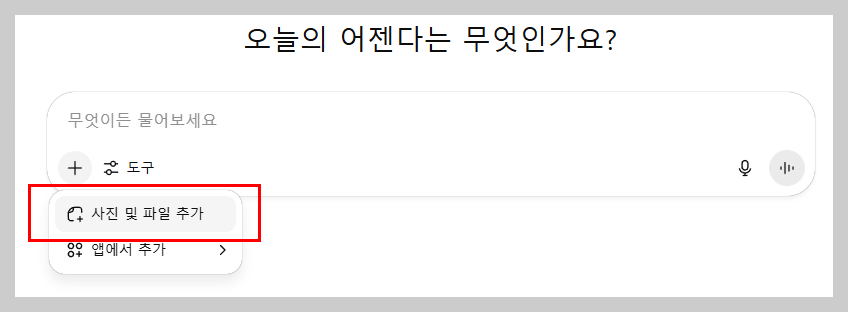 2. 쳇지피티 왼쪽 하단 '사진 및 파일 추가' 버튼을 클릭해요.