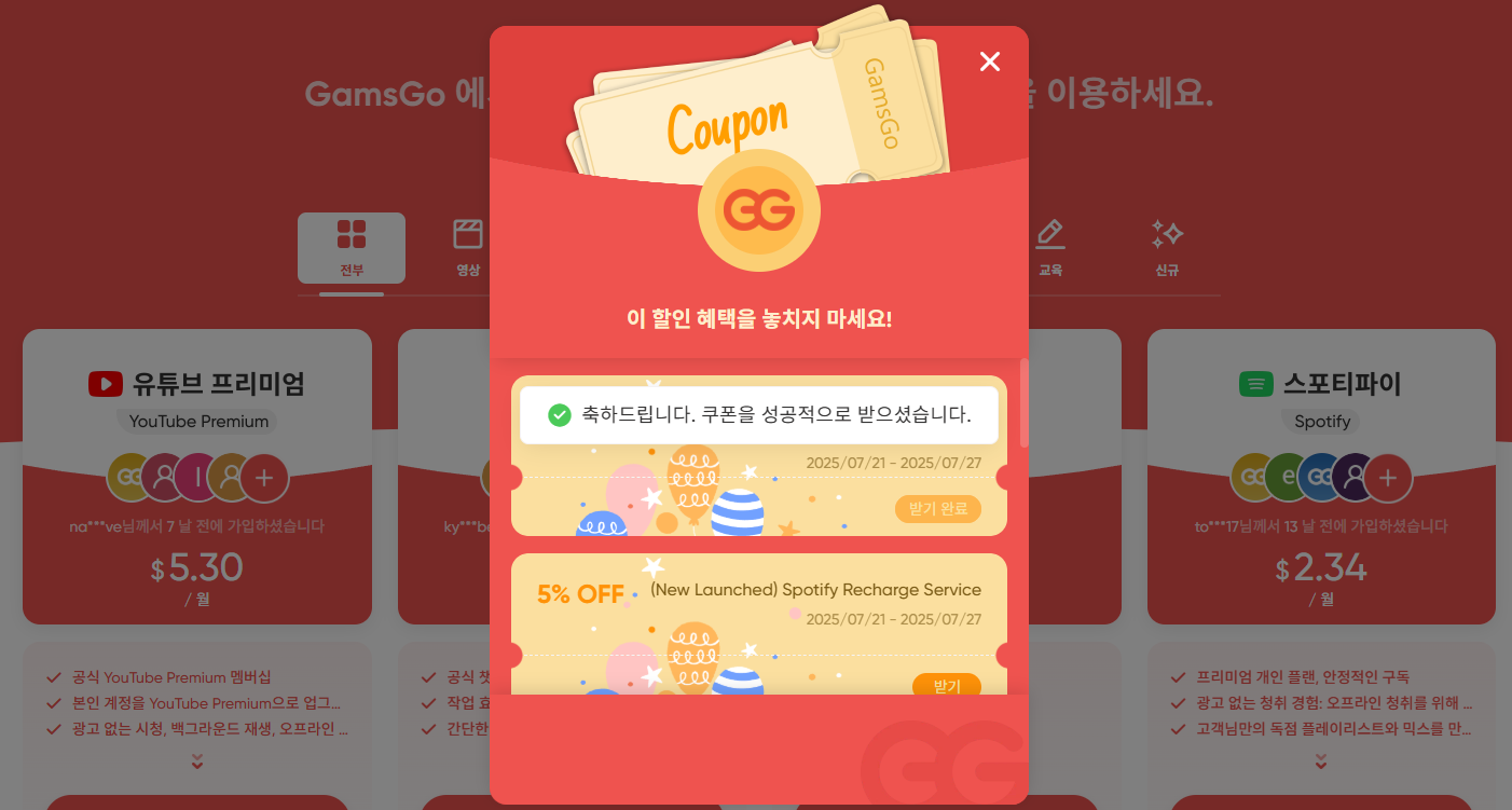 Gamsgo 유튜브 프리미엄, 넷플릭스, 쳇지피티 등 할인 이용법 정리!갬스고는 넷플릭스, 유튜브 프리미엄, 디즈니+, 스포티파이 같은 유료 서비스를 여러 사람이 함께 구독할 수 있도록 중개해주는