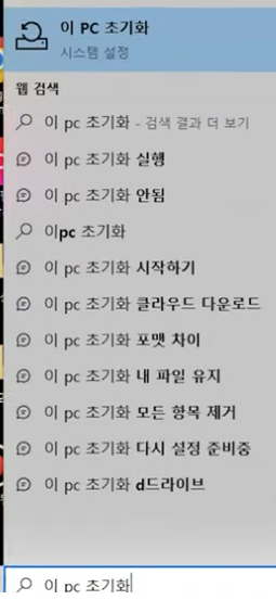 - 검색창에 '이 PC 초기화' 입력 > 시작 클릭
