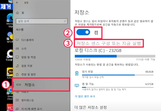 - 설정 > 시스템 > 저장소 메뉴로 들어가서 저장소 센스를 ‘켬’으로 바꿔주세요.