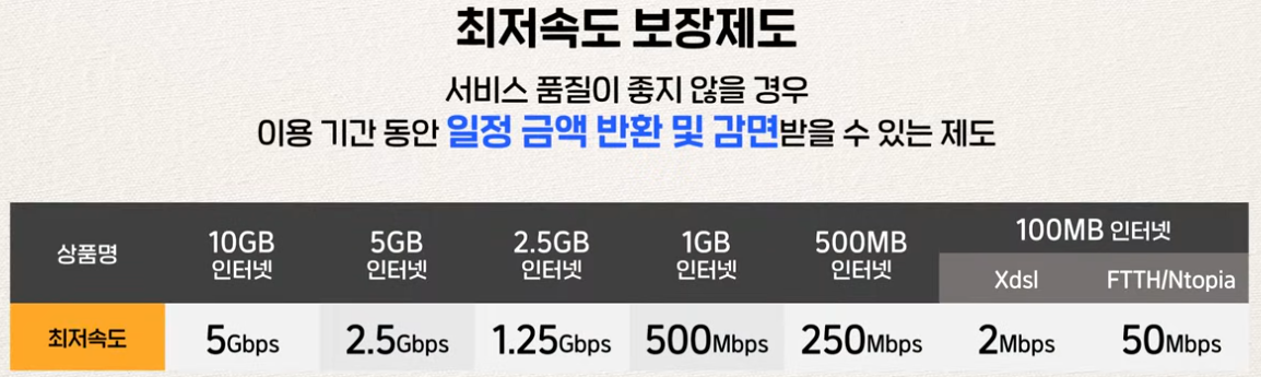 그리고 속도가 너무 느릴 경우에는 ‘최저속도 보장제도’를 통해 당일 요금 감면 또는 위약금 없는 해지가 가능합니다.