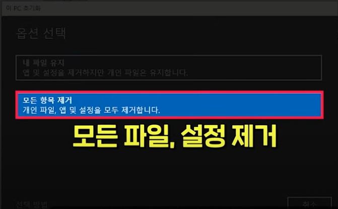 만약 가능하시다면 외장 하드에 데이터를 백업한 후 '모든 항목 제거'를 선택하는 것이 좋습니다. 이렇게 하면 윈도우가 새로 설치되며 악성 코드, 오류, 불필요한 앱이 모두 사라지기 때문에 체감 속도가 확 올라가요.