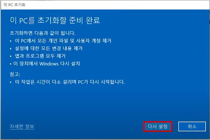 초기화는 평균 20~30분, 길게는 1시간 정도 소요됩니다. 끝나고 나면 처음 컴퓨터를 구매했을 때처럼 깔끔한 상태로 재시작되니 한 번쯤 시도해볼 만합니다.