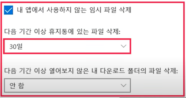 - '앱에서 사용하지 않는 임시 파일 삭제'를 30일로 설정하고 '지금 정리 시작'을 눌러 주세요.