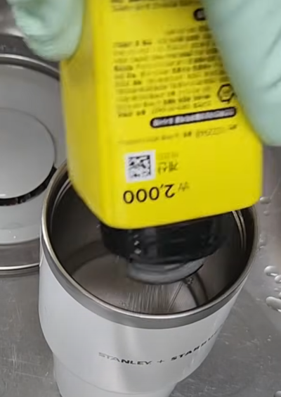 - 텀블러에 과탄산소다 한 스푼을 넣고, 뜨거운 물을 가득 부어줍니다.