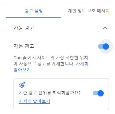 - 애드센스 페이지 화면 오른쪽 사이드 바에 보시면 광고 설정 탭에서 자동광고 활성화(애드센스에서 광고 자리를 자동 설정합니다.)
