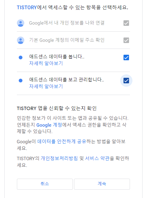 - Google 로그인 버튼 클릭 → 액세스할 수 있는 항목 선택에서 모두 선택 → 계속 버튼 클릭