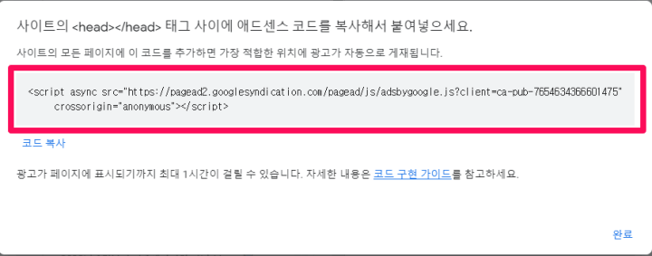 - 애드센스 코드를 드래그하여 복사 또는 밑에 코드 복사 클릭