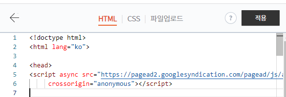 - 자신의 티스토리 페이지로 돌아가서 스킨 편집 → HTML 편집 클릭 → <head> 밑에 코드 복사 → 적용 완료