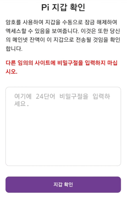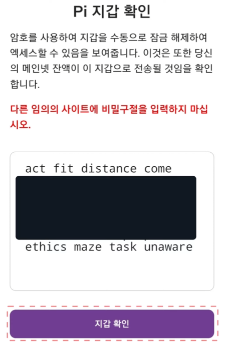 파이코인의 개인 지갑을 보호하는 핵심 정보로, 24개의 단어로 구성된 비밀 구절이 필요합니다. 이 비밀 구절은 인증 과정에서 필수적으로 사용되므로 미리 준비해 주세요.