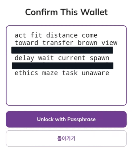 - 스팸 광고 화면에는 지갑 주소가 표시되지 않으므로, 비밀 구절을 입력하지 않도록 주의하세요.