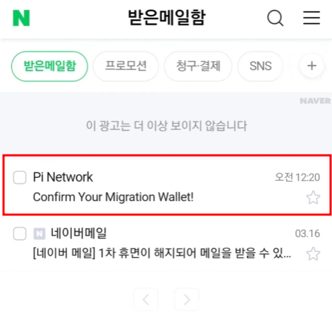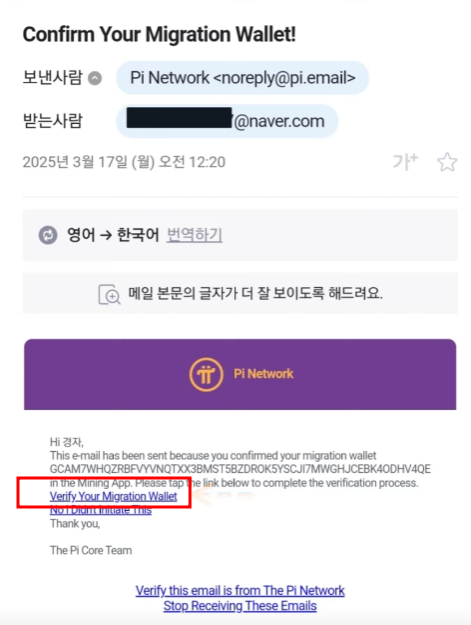 - 이메일을 확인하여 Pi Network 공식 메일인지 확인한 후, ‘Verify Your Migration’ 버튼 또는 "Verify this email is from The Pi Network" 버튼을 클릭합니다.