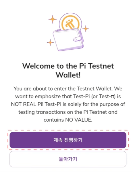 - 이후 계속 진행(Continue) 버튼을 누르면 테스트용 지갑 화면으로 이동합니다.