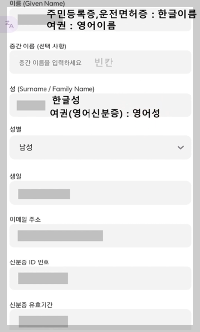 이름과 성은 신분증에 표기된 대로 정확히 입력해야 합니다. 철자나 띄어쓰기까지 동일해야 하며, 여권은 영어 이름, 주민등록증과 운전면허증은 한글 이름을 사용해야 합니다. (중간이름은 비워도 됩니다.)