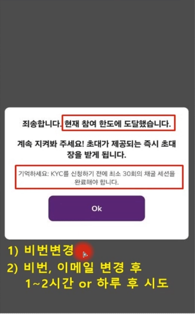 KYC 신청 시 "현재 참여 한도에 도달했습니다"라는 메시지가 뜨는 경우, 채굴앱의 번개 버튼을 눌러 최소 30회의 채굴 세션을 완료해야 합니다. 만약 30회 이상 채굴을 했음에도 같은 오류가 발생한다면 비밀번호 변경 후 재시도하거나, 이메일 변경 후 일정 시간이(하루 정도) 지난 뒤 다시 시도해보면 해결되는 사례가 있습니다.